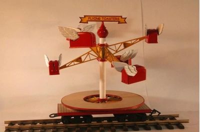 THE RIDE ......The latest and hottest midway ride was the FLYING TOASTERS. The rider could raise and lower the toaster as the ride turns. This was a usual feature on many rides, but with these toasters the raising and lowering of the toaster accordingly raised and lowered the internal temperature as with a real toaster. Ah, the 'dark side' of this CARNIVALE ride emerges.