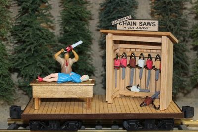 Leatherface, gesturing to the crowd to quiet down, walks to the saw shed, gently stroking each saw, his eyes asking the crowd to help him select a saw......crowd loudly responds......bigger, bigger [this is the period of miss-direction required to divert the attention of the crowd; the reason for this will be revealed later]. Choice made, gripping it with one hand and pulling the starter rope with the other, it roars to life......the crowd also roars......of course they do.