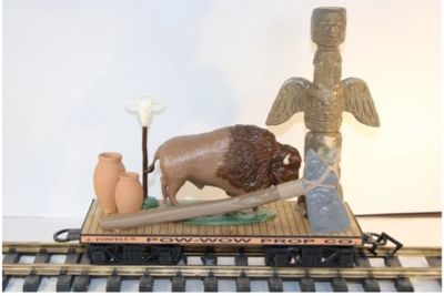 The carnival world made good use of props to attract customers to their various attractions. And bigger was always better. The POW-WOW PROP CO. was there to fill the bill when INDIAN themed pieces were required. Using some actual vintage toys as the props seemed only logical. Because of using vintage pieces, the reproduction ones were finished similar to the real ones. I placed a worker figure on each car to show scale. The rail car carrying actual Native American miniature clay pots are from my wife Gail's collection brings the car count to four.