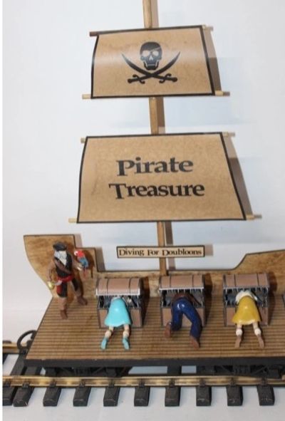 Each of the pirate's treasure chests contained a large quantity of cheap plastic pirate treasures such as rings, jewels, pins, silverware, trinkets, etc. and 'AS ADVERTISED'--ONE GENUINE SPANISH GOLD DABLOUN. When the pirate's parrot squawked go, the players, now pinned down by the lid of a dark and water filled chest, would struggle to find the elusive DABLOUN. A DABLOUN was actually in each chest, but 'somehow' each had gotten wedged into a crack between the inside wall and floor of the chests, making them all but impossible to find and remove.......ALSO TRUE