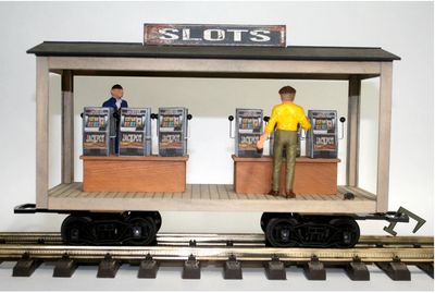 The slot machines are shaped pieces of wood wrapped with printed slot machine images. Handles are brass rods with a proper size bead. The people are my castings. Do you see any missing mice?