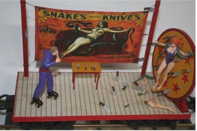 The Baleys; Bob, wives Betty #1, Betty #2, Betty #3, and Betty #4 (all will become clear in time) of Bakersfield, along with son Bubba and twin daughters Buffie and Bambie, have been performing as the 'AMAZING BALENSKIS’ from Romania with CARNIVALE for many years. In their earlier life, back in Bakersfield, Bob with wife Betty #1 ran a butcher shop called BOB THE BUTCHER, the girls were roller skating car hops at a Giant Orange Drive-In out on Highway 99, while son Bubba collected lizards. Bob and Betty #1 were performing their knife throwing act, when an error made by Bob required a second marriage ..... not good ..... Another performing accident (Bob again) the following year with wife Betty #2 required a third marriage ..... very not good.